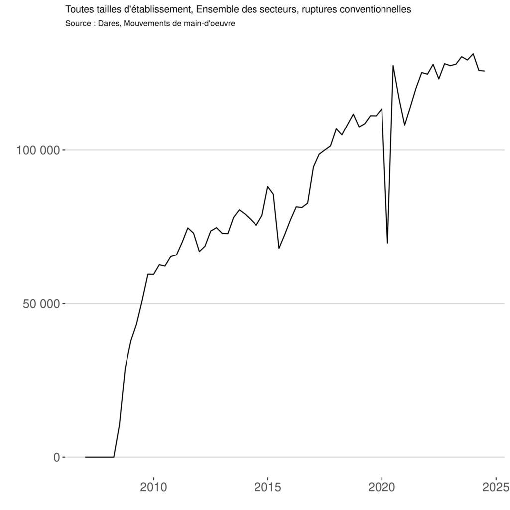L’analyse des données de la Dares révèle une évolution significative de la rupture conventionnelle depuis son instauration. Au troisième trimestre 2024, on dénombre 125 751 ruptures conventionnelles en France métropolitaine, ce qui marque une baisse légère de 0,1 % par rapport au trimestre précédent. Cette stabilisation à un niveau élevé témoigne de l’ancrage durable de ce dispositif dans le paysage social français.