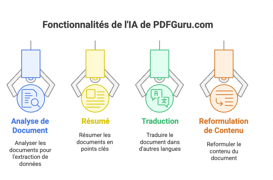 Des applications comme PDFGuru.com prévoient les fonctionnalités suivantes, en utilisant l’IA : analyse de document, extrait et résumé des données des documents PDF, afin d’en faciliter leur gestion. Profitez de l’intelligence artificielle pour résumer de longs documents en points clés à retenir. L’analyse de texte par l’IA peut fournir des informations qu’il était auparavant difficile d’obtenir à partir des systèmes traditionnels de gestion des documents.