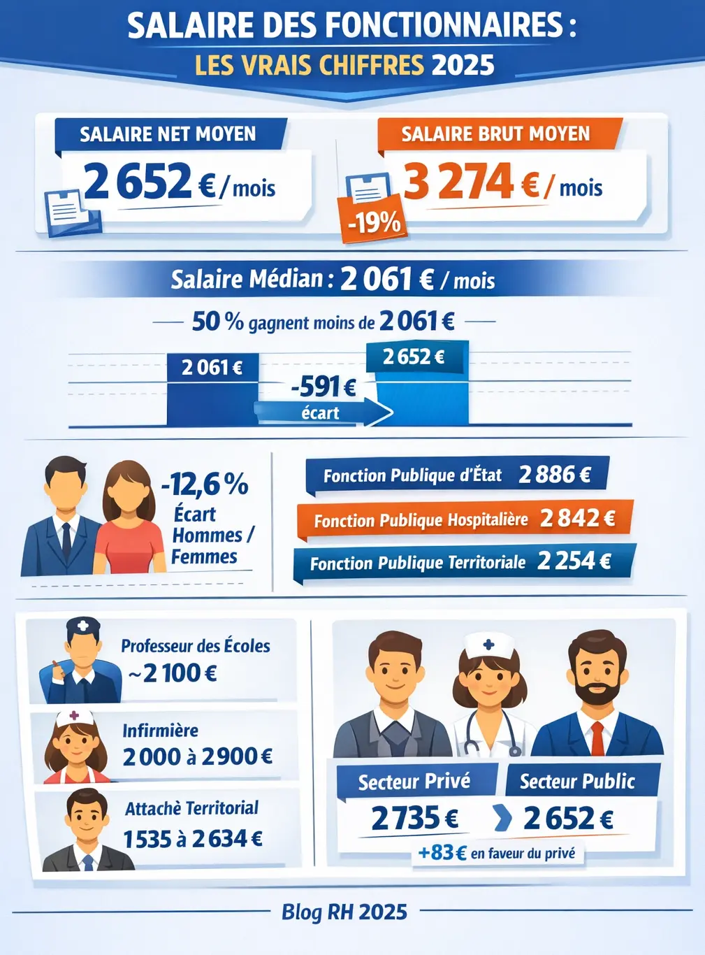 - Salaire net moyen : 2 652 € par mois — mais 50 % des fonctionnaires gagnent moins de 2 061 €.