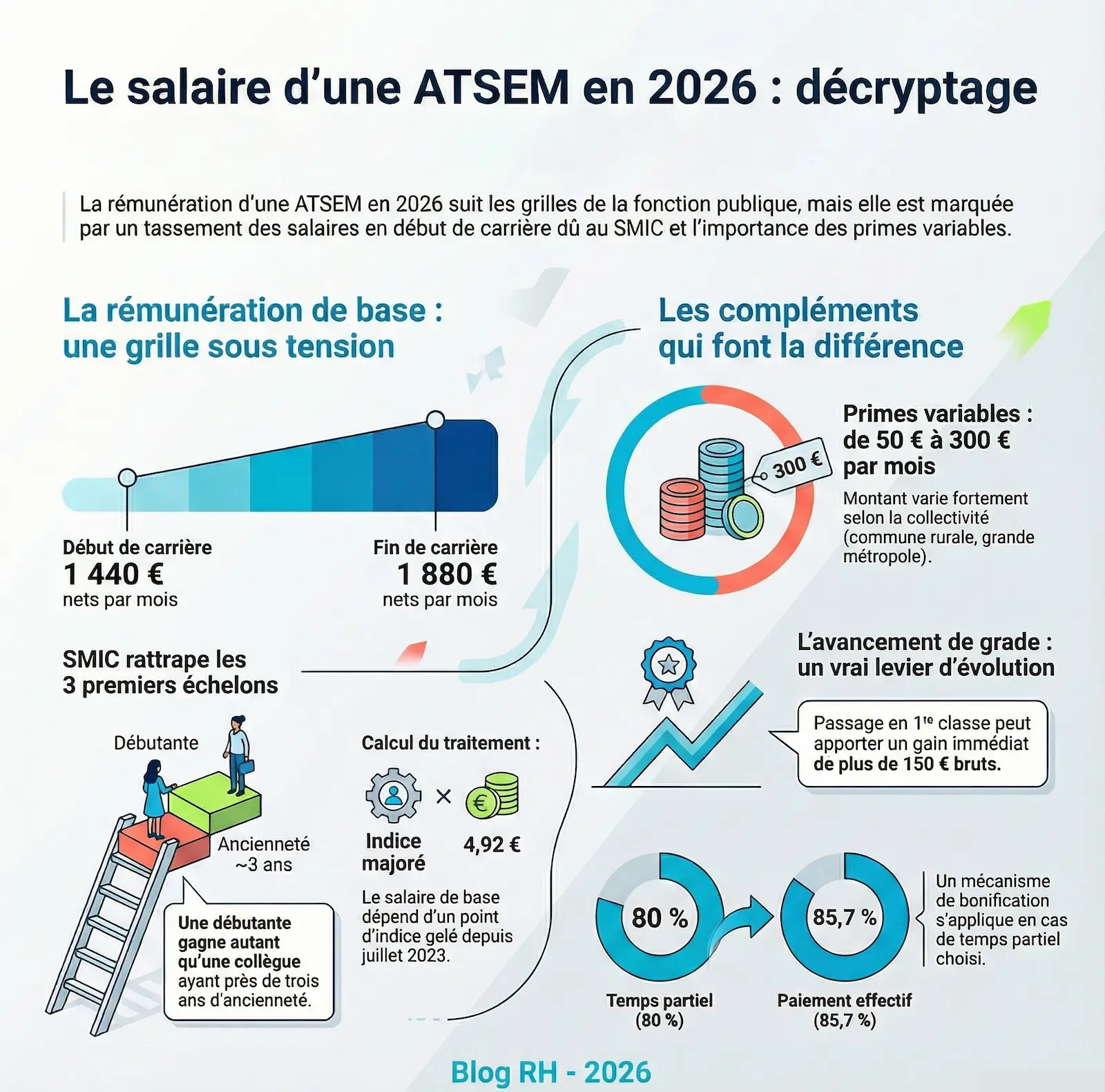 - Salaire ATSEM débutante en 2026 : 1 823 € brut (SMIC), soit environ 1 440 € net par mois.